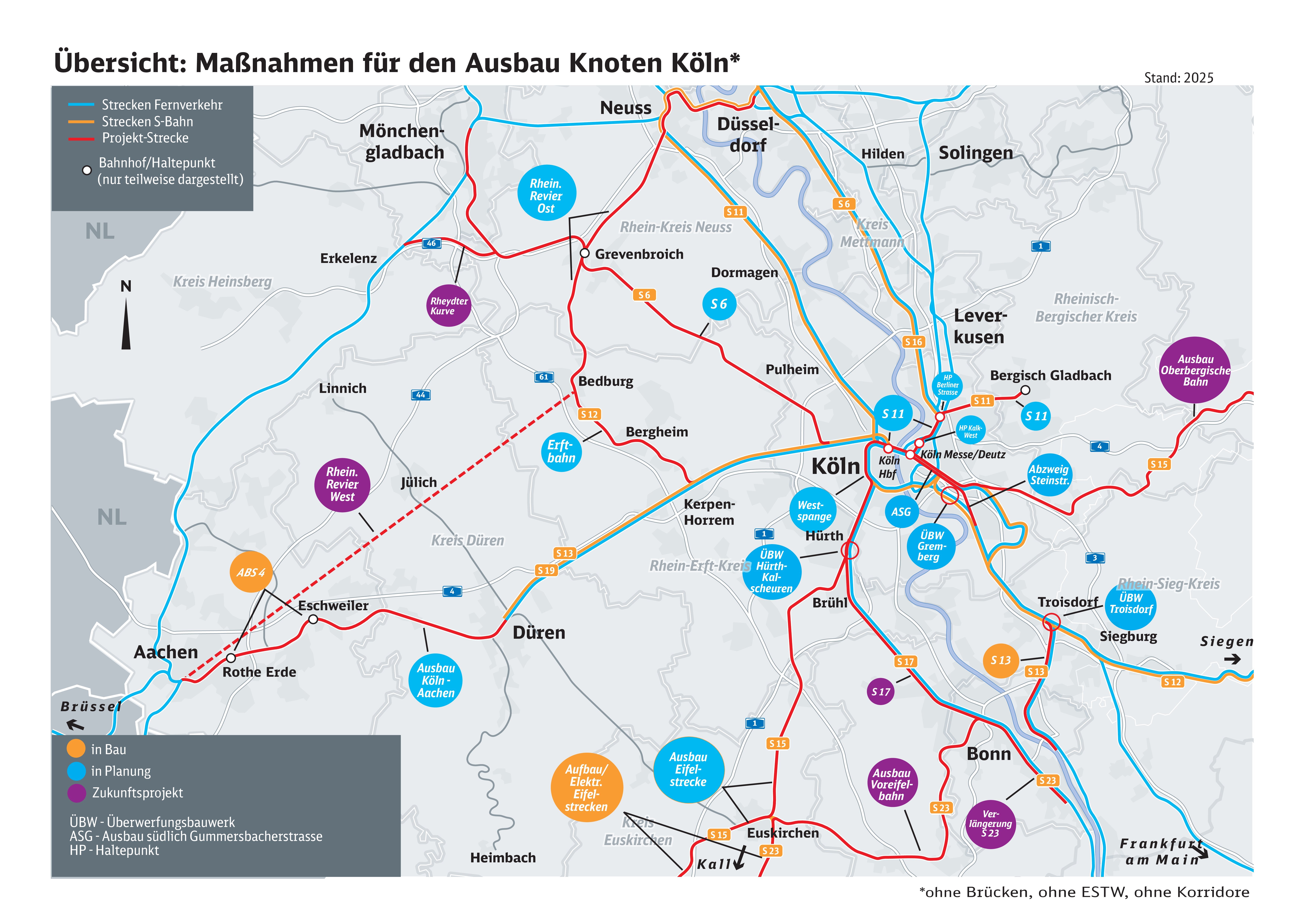 Im Knoten Köln sind aktuell 16 Ausbauprojekte mit weiteren Unterprojekten für eine bessere Schieneninfrastruktur in Planung und Bau. Sie werden in vielen Teilschritten geplant und aufeinander abgestimmt. Dabei verbessert jedes einzelne Projekt den Nutzen für die Menschen in der Region.